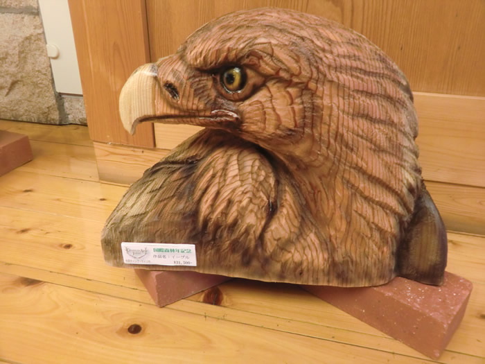 龍神温泉のロビーには、木製の鷲、小熊、フクロウの置物。チェンソーによるアート。 この作品は、世界チャンピオン・ケイジの名作だ。知多の早ちゃんもチェンソーアート クラブのメンバーだ。