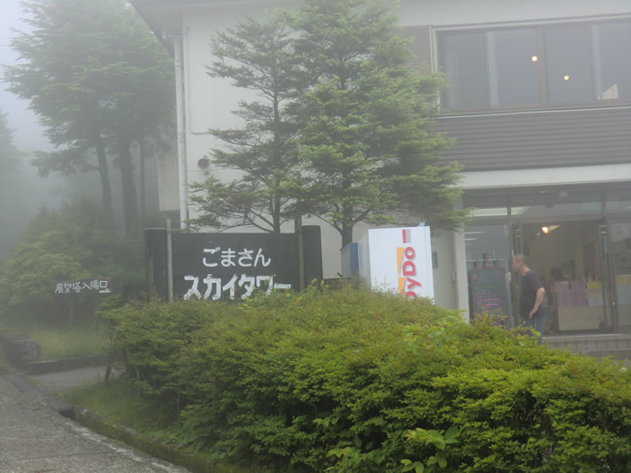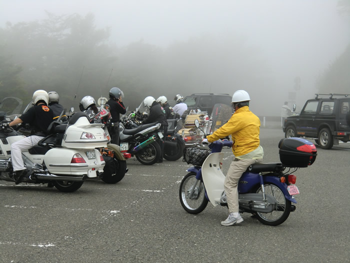 龍神スカイラインは、霧が深く、路面が濡れて、走りにくかった。工事現場の兄ちゃん?・・・ 100ccのカブで参加した、かじやん・・・護摩山駐車場にて。