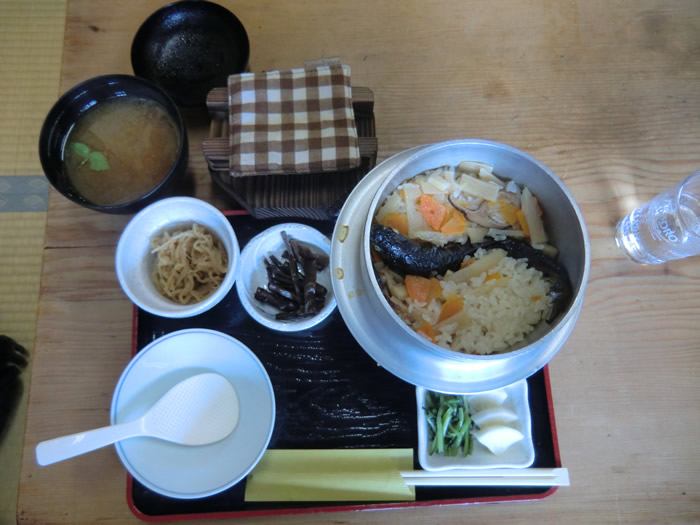 温泉は、淡横褐色、ナトリウム温泉だ。 入浴前に注文した、あめの魚釜めし(1500円)