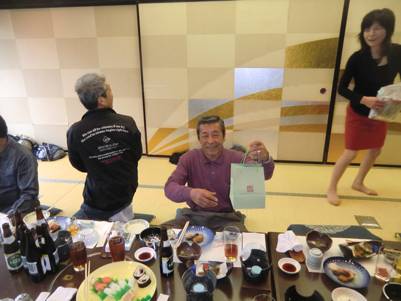 ![]() 乾杯はティッシュ?紙へん(かまへん)紙へん(かまへん)。景品のバックルが光るやなさん。 |