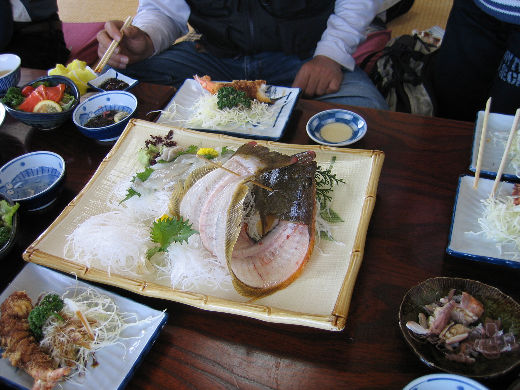 三階のお座敷にて・・お造り・ヒラメの活け作り・カニ(カキフライ