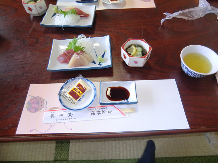 最初は、マグロとハマチの刺身、もずくの酢の物。 お刺身はぷりぷりでマイウー。 もずくもGU−.