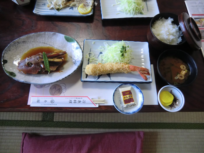 ほうぼうの煮付けを選びました。 大きな海老のフライは甘くて