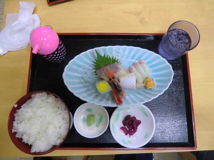 ![]() 昼食は、とれとれセンターの新鮮な魚が旨い「ととや」で。 日替わり刺身定食(1160円)刺身は、ぷりぷりでマイウー! |