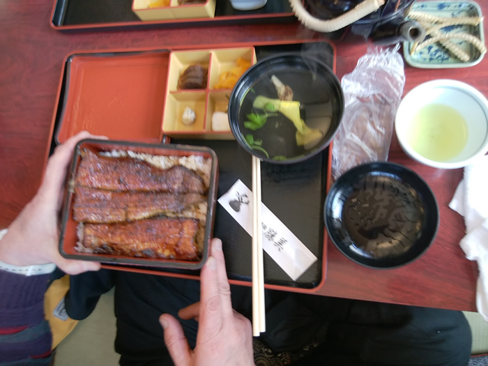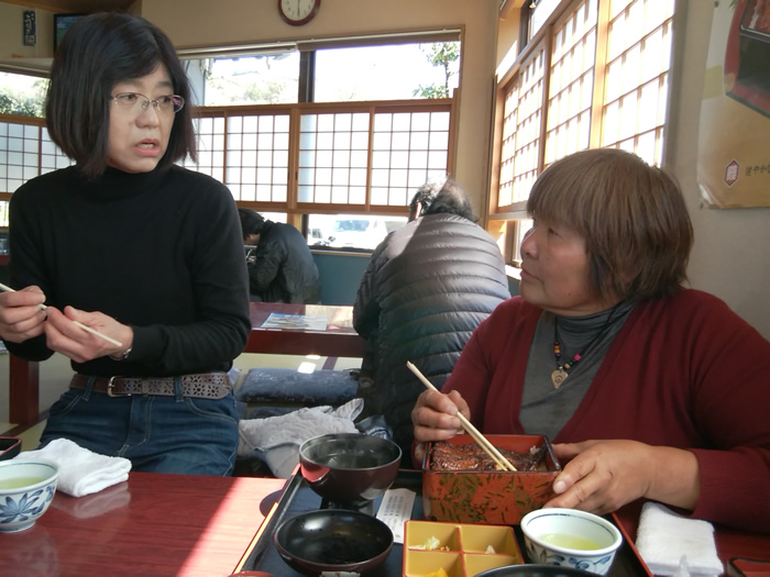 ![]() 小食のやなさん、うなぎ丼(1600円)を注文するも、ご飯を半分、 益田さんに取ってもらう |
