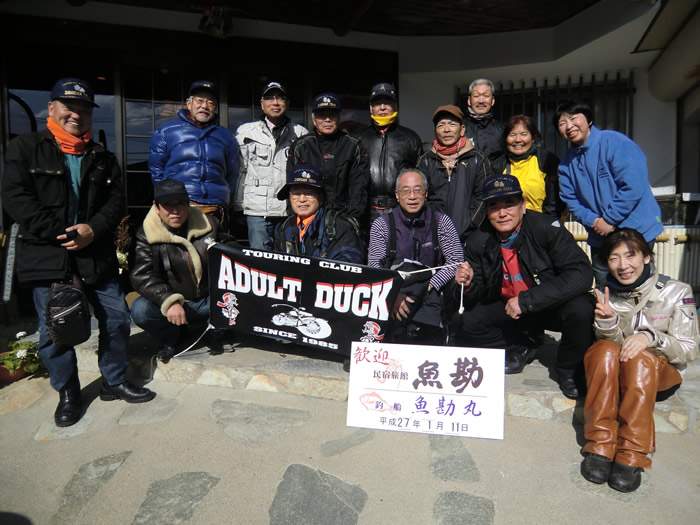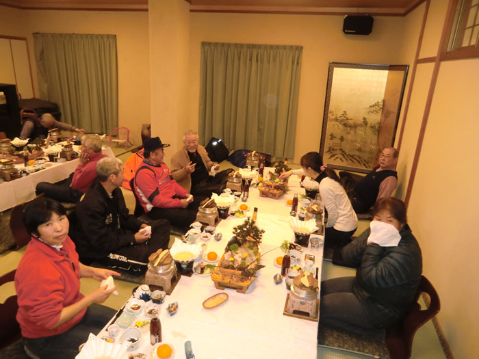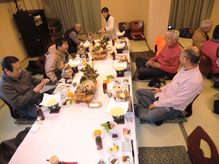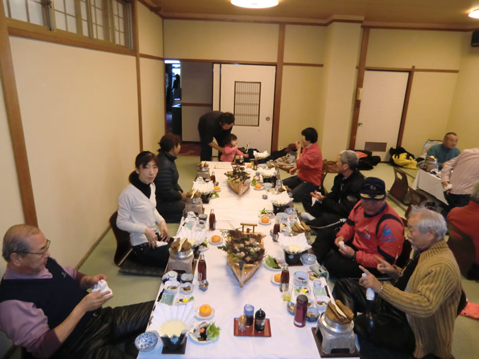 食事の前にくつろぐメンバー。 鯛やヒラメの舟盛り等が運