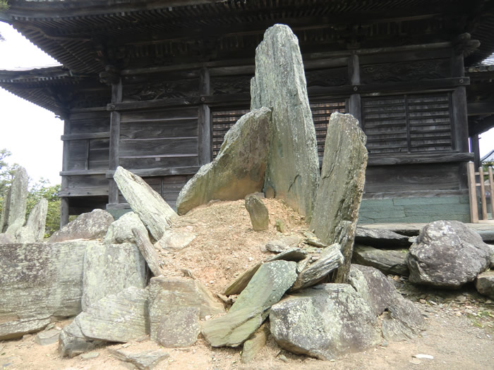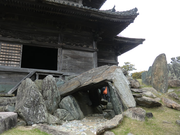 本堂西側の巨石石組。 高さ4M30の立石(りっせき)圧倒される。