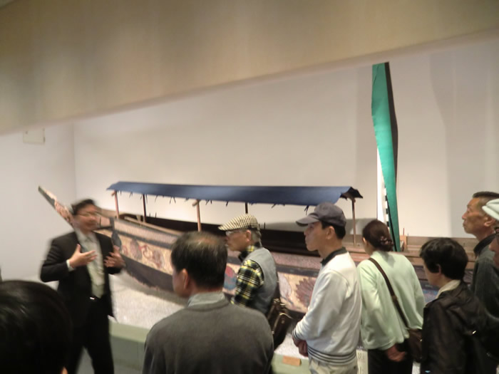 館長から長さ 10.5M重さ13トンの自然石橋(緑泥片岩)の説明を聞く。