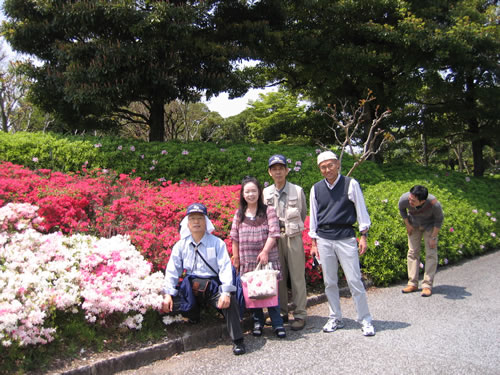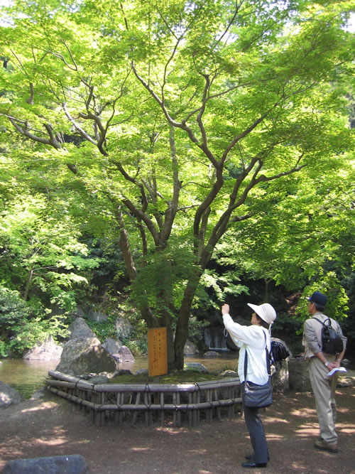 ○ 名木の一つ・株立ちのヤマモミジと滝の前で記念写真! |