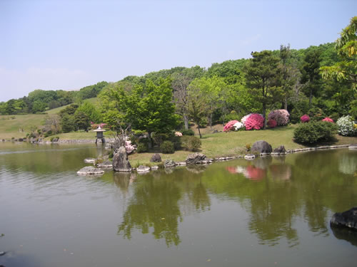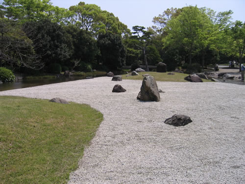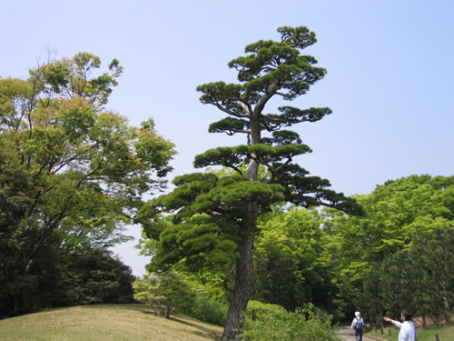 休憩所の背景に築山と名木のマツが大きな額縁に入った名画として鑑賞できる。 |