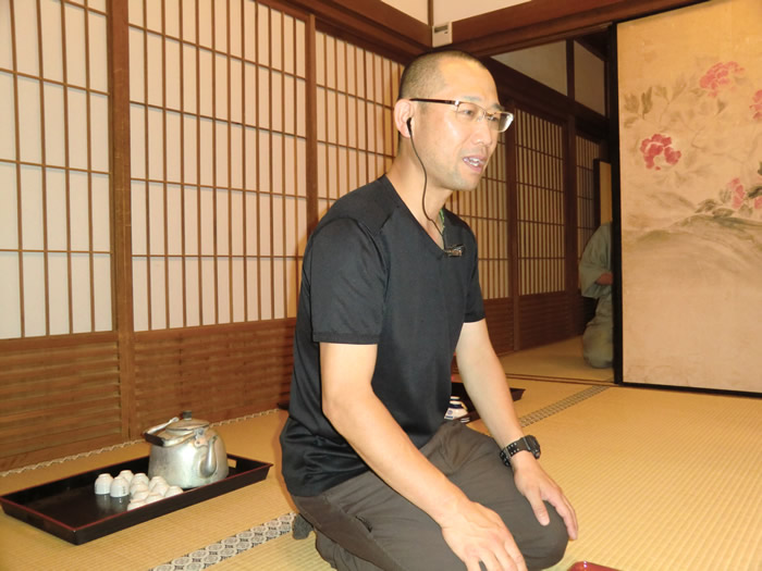 酒井氏は、吉城園の英文案内を朗読する。柳本氏が関心する。