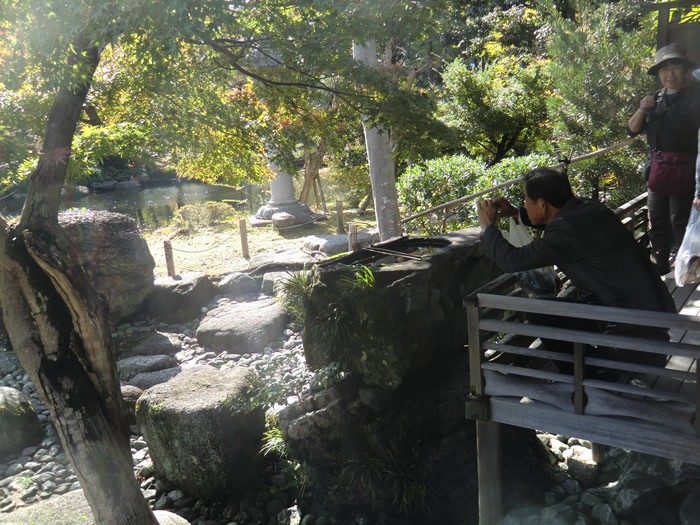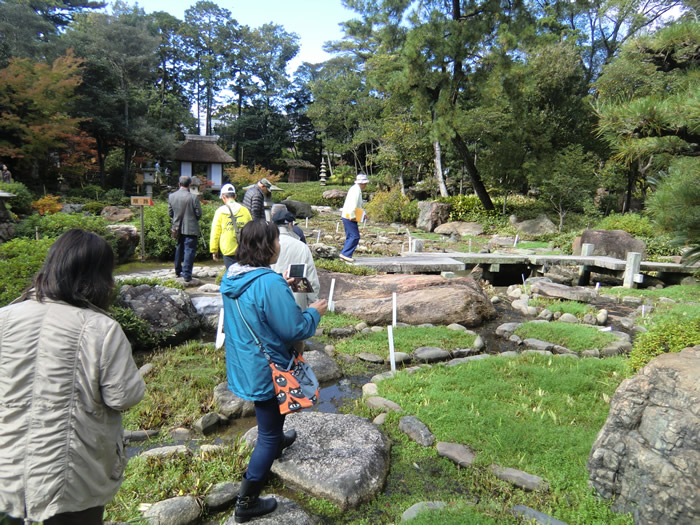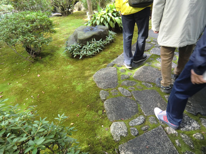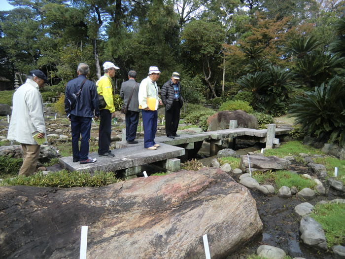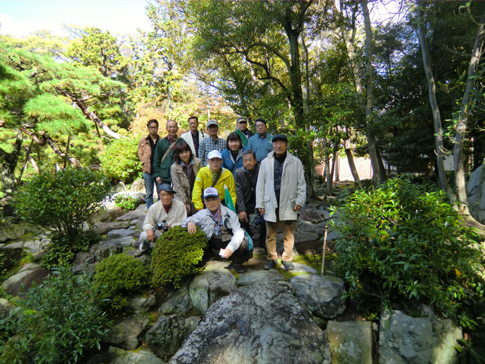 池の庭にて記念写真。飛び石には青石が多く使われている。