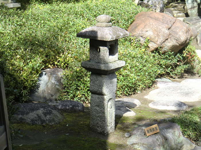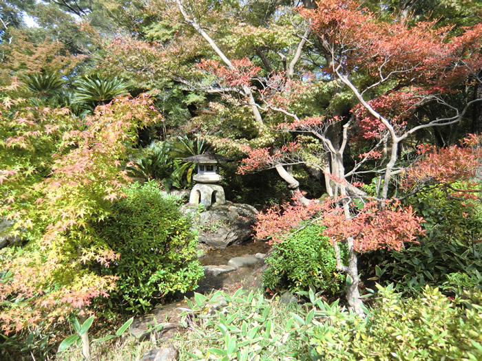 日障りのモミジの奥には、雪見灯籠が据えられている。