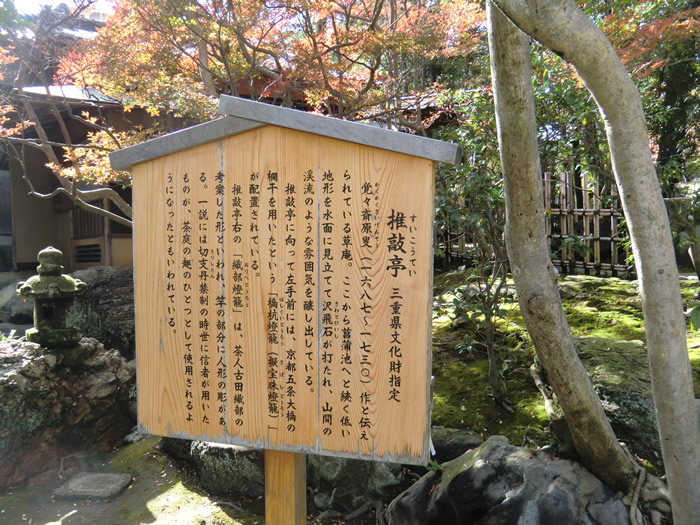 「推敲亭」(すいこうてい)の案内版。三重県文化財指定だ。