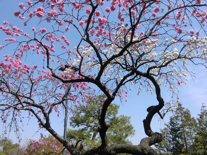 一本の木に紅白の八重桜、まるで造花。
