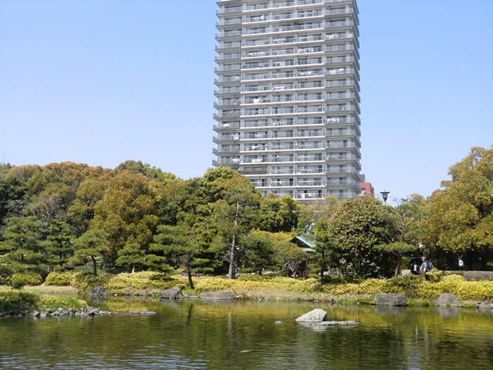 中の池風景、大きなマンションがそびえている。