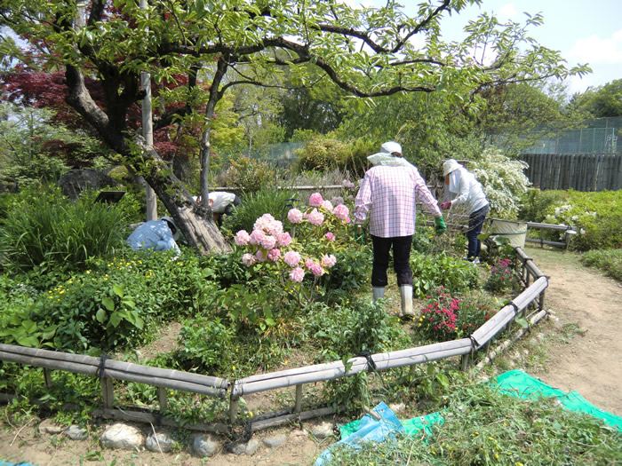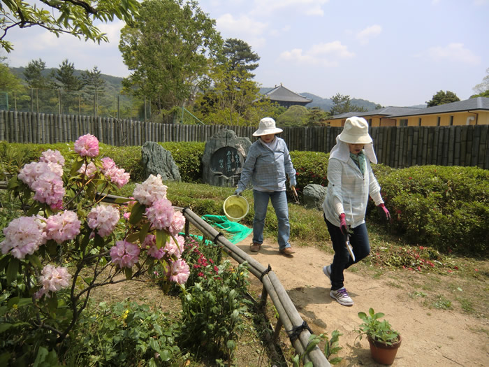 雑草を取って、足取りも軽い、山根さん、森田さん。シャクナゲも