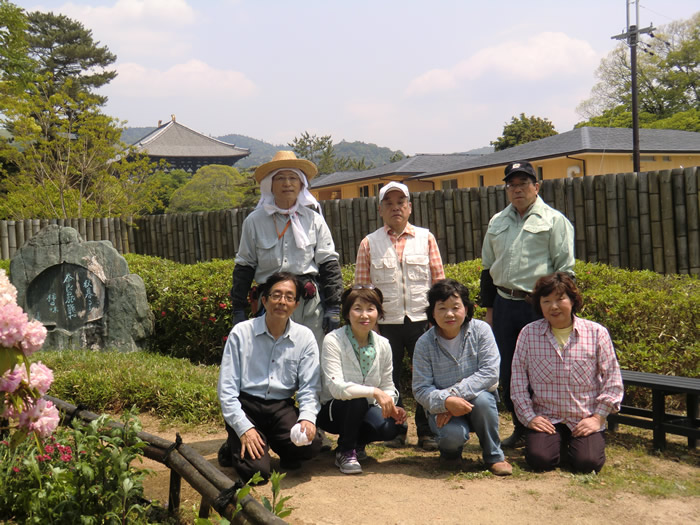 作業が一段落し、整備された子規の庭で記念写真を撮りましょう。